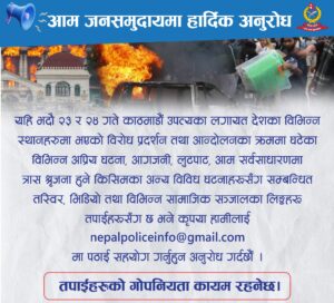 काठमाडौं । जेनजी आन्दोलनका क्रममा भएको आगजनी, तोडफोड र लुटपाटका घटनामा संलग्न व्यक्तिहरूलाई कानूनी दायरामा ल्याउन नेपाल प्रहरीले आम नागरिकसँग […]